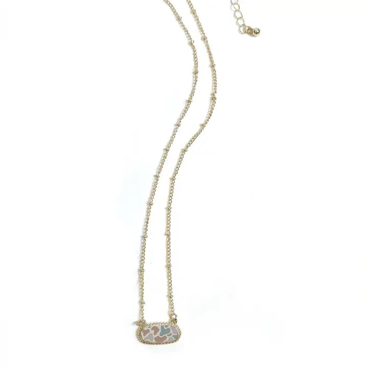 This pendant/charm necklace is a nod to our love for the Midwest and its rich, outdoor culture. It's a versatile piece that pairs well with denim, boots, and even a touch of turquoise. Enjoy the blend of fashion and tradition with our Camo Necklace.